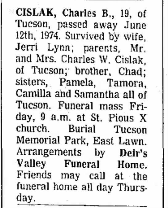 Charles B. Cislak, 19, of Tucson, passed away June 12th, 1974.